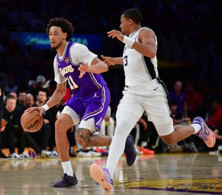 北京时间11月6日湖人主场对阵马刺,全场比赛结束湖人以118-116成功击败了马刺。本场比赛湖人缺少了詹姆斯和里夫斯,所以本场比赛对于东契奇来说是一个巨大挑战,毕竟马刺在本赛季打得不错,如今东契奇独自带队时是面临困境,果真在这场比赛中马刺一度领先到两位数,而且在这场比赛中东契奇的进攻效率也不是很高,所以湖人打得很艰难,不过本场比赛中斯玛特在防守端帮助到球队,艾顿也在内线起到巨大作用,加上八村塁还能够得到一些分数,最终湖人还是成功逆转马刺赢下比赛胜利。